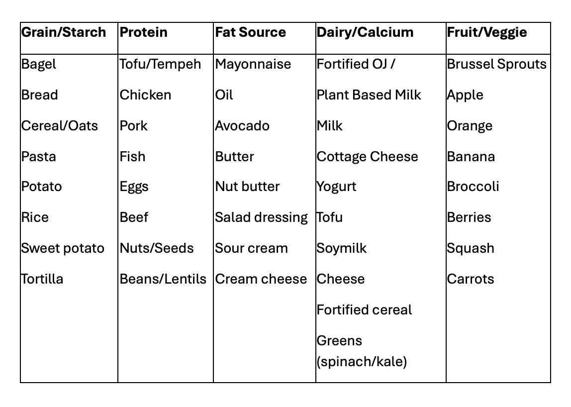 Parents can guide their child’s nutrition habits by offering components from each food group at mealtimes. Children remain in charge of whether to eat each food and how much they want to eat. To get started with incorporating the MyPlate method, it can be helpful to make a list of foods from each food group that your family typically has in the household or enjoys. Here is an example below.